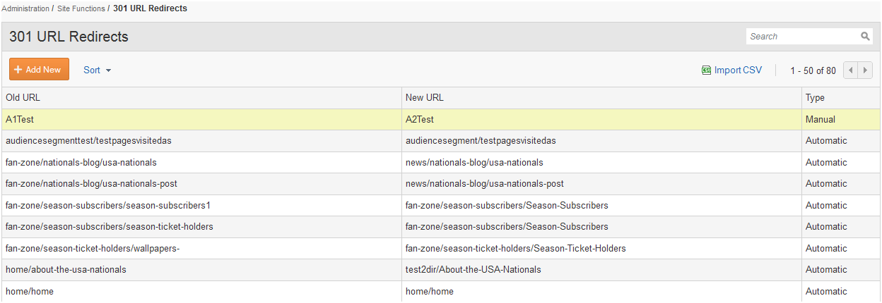 To reach the 301 URL Redirects interface, choose Administration > Site Functions > 301 URL Redirects.