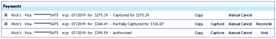 Obtains the amount of funds for payment. Once the product or part of the product is ready to ship, this link tells the system to capture funds up to the amount of the product shipped. If the order is shipped in parts, some payment gateways will only capture the funds for the portion of the order that shipped. While others do not provide for partial captures. Check with your site administrator to see how the payment gateway for your website behaves. Note that credit card authorizations can be voided and released from the Commerce admin, but after an amount is captured it cannot be refunded through iAPPS. This must be done through the payment gateway. |