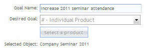 Once you have selected a goal type, the “Select Object” button becomes active and the button text updates to “Select a Product.” Clicking the “Select a Product” button brings you to the “Search and Add Products” pop-up. Type the product name, such as ‘seminar’ in the Search field to find the product name and click the Add button. This will fill in the product name: