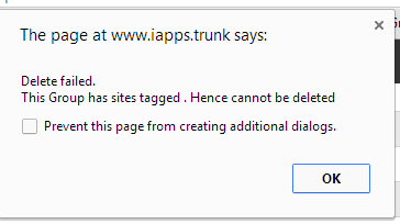 Before deleting a Site Grouping you must remove any sites that are associated with the group from it. Only then can you delete it.
